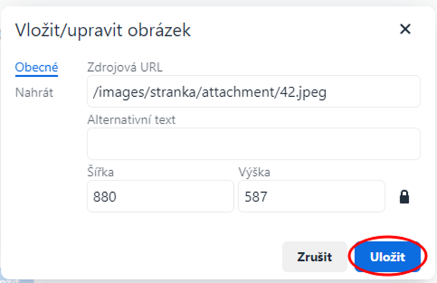 - Obrázek se nahraje a stačí uložit (obrázek se vloží na místo kurzoru v textu. Obtékání lze nastavit pomocí zarovnání textu)